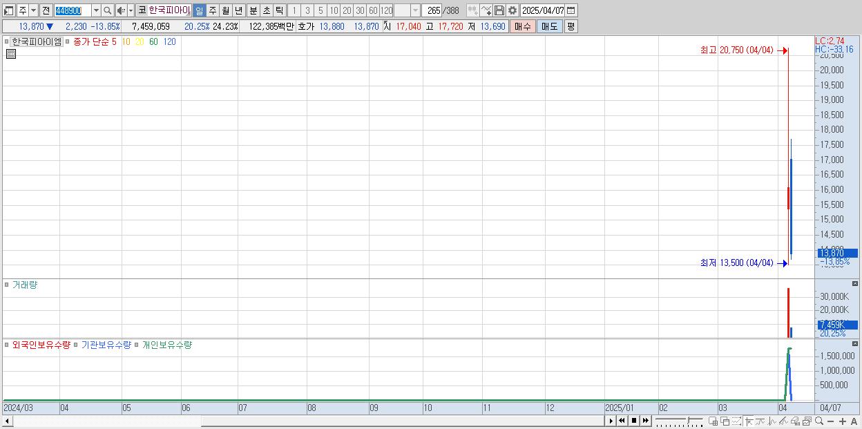 - 한국피아이엠 (13,870원 ▼ -13.85% , 시총: 833억, 거래량: 7,459,059, 거래대금:1,224억)
