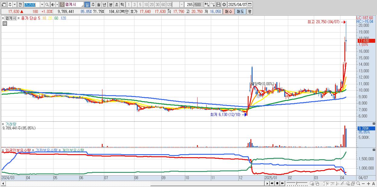 - 웹케시 (17,630원 ▲ 1.03% , 시총: 2,404억, 거래량: 9,789,441, 거래대금:1,846억)