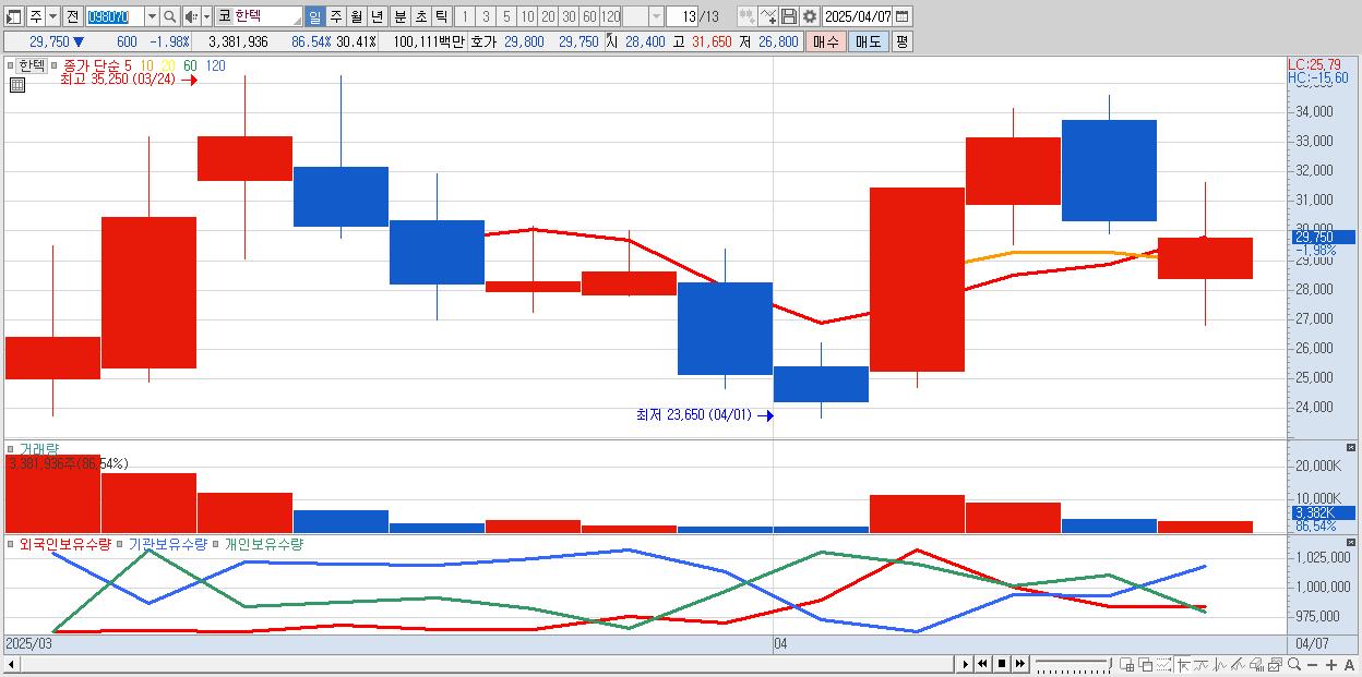 - 한텍 (29,750원 ▼ -1.98% , 시총: 3,309억, 거래량: 3,381,936, 거래대금:1,001억)