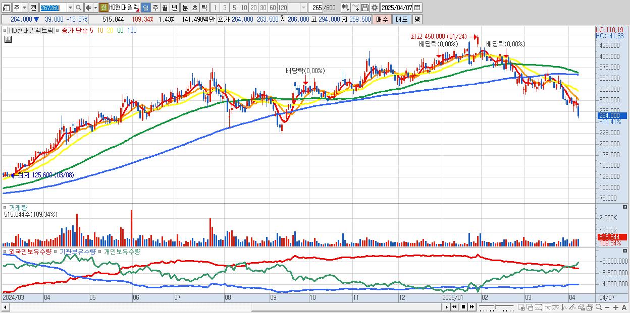 - HD현대일렉트릭 (265,000원 ▼ -12.54% , 시총: 95,525억, 거래량: 373,643, 거래대금:1,025억)