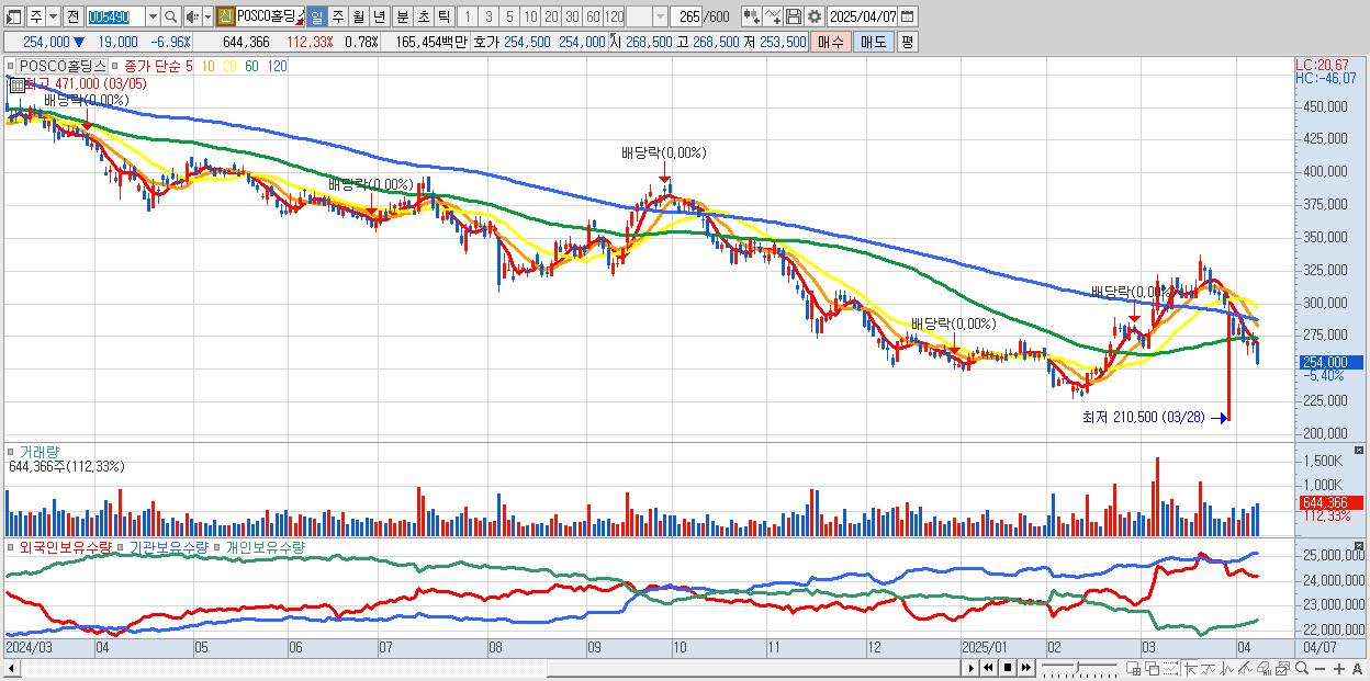 - POSCO홀딩스 (255,000원 ▼ -6.59% , 시총: 210,692억, 거래량: 510,440, 거래대금:1,310억)