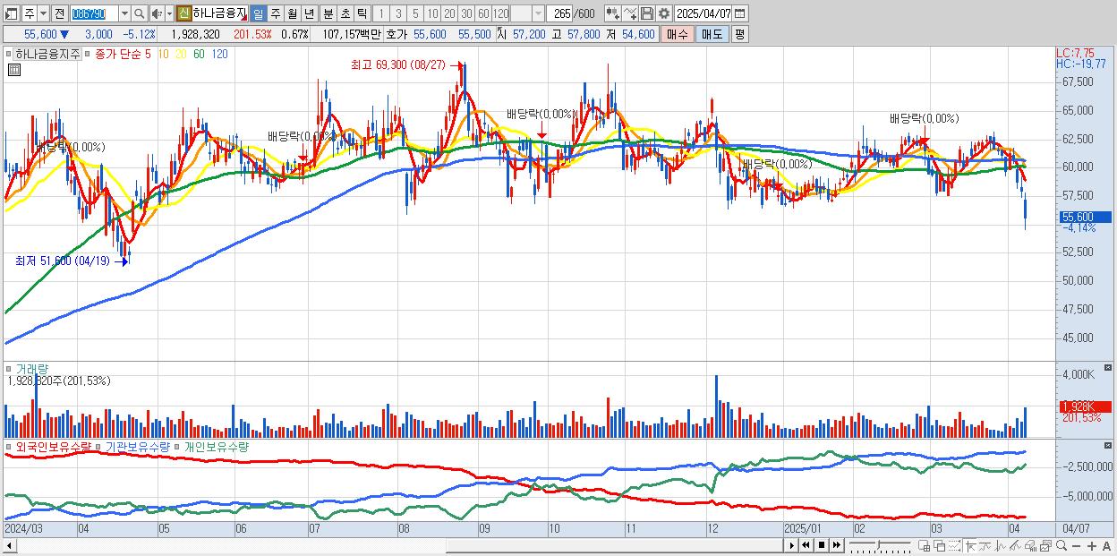 - 하나금융지주 (55,300원 ▼ -5.63% , 시총: 158,844억, 거래량: 1,757,351, 거래대금:976억)