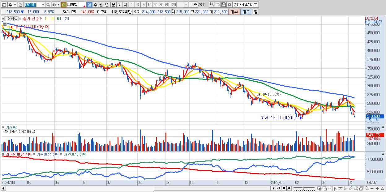 - LG화학 (213,500원 ▼ -6.97% , 시총: 150,715억, 거래량: 457,294, 거래대금:987억)