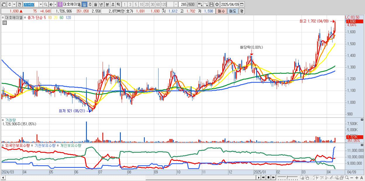 - 대호에이엘 (1,690원 ▲ 4.64% , 시총: 1,146억, 거래량: 1,726,906, 거래대금:29억, KOSPI)