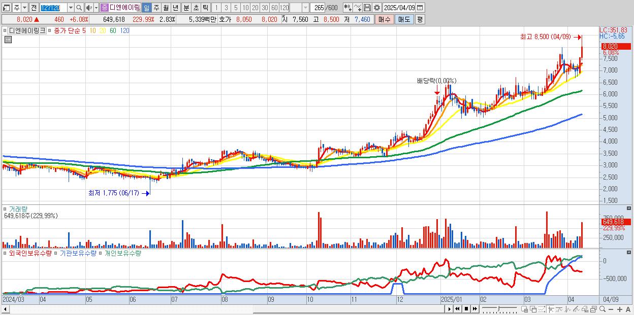 - 디엔에이링크 (8,020원 ▲ 6.08% , 시총: 1,841억, 거래량: 649,618, 거래대금:53억, KOSDAQ)