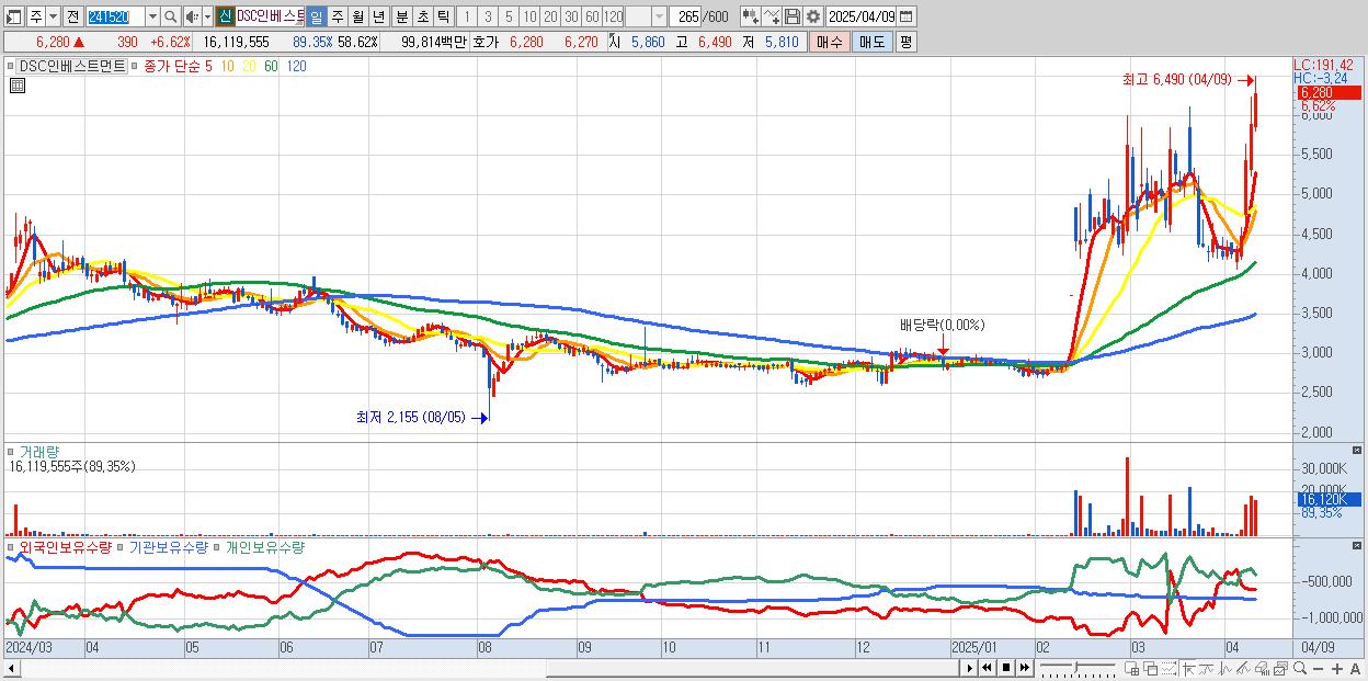 - DSC인베스트먼트 (6,280원 ▲ 6.62% , 시총: 1,727억, 거래량: 16,119,555, 거래대금:998억, KOSDAQ)
