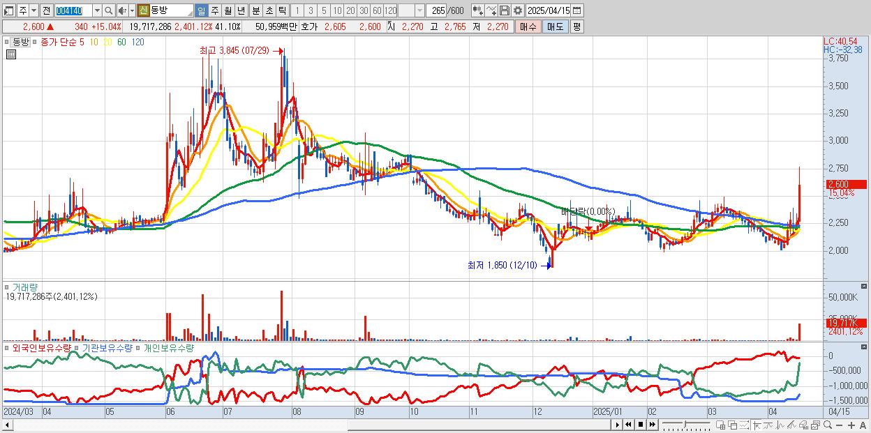 - 동방 (2,600원 ▲ 15.04% , 시총: 1,247억, 거래량: 19,717,286, 거래대금:510억)