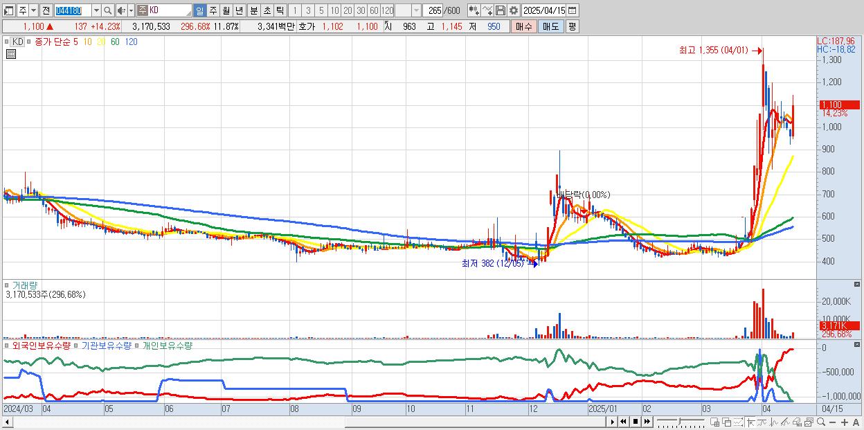 - KD (1,100원 ▲ 14.23% , 시총: 294억, 거래량: 3,170,533, 거래대금:33억)