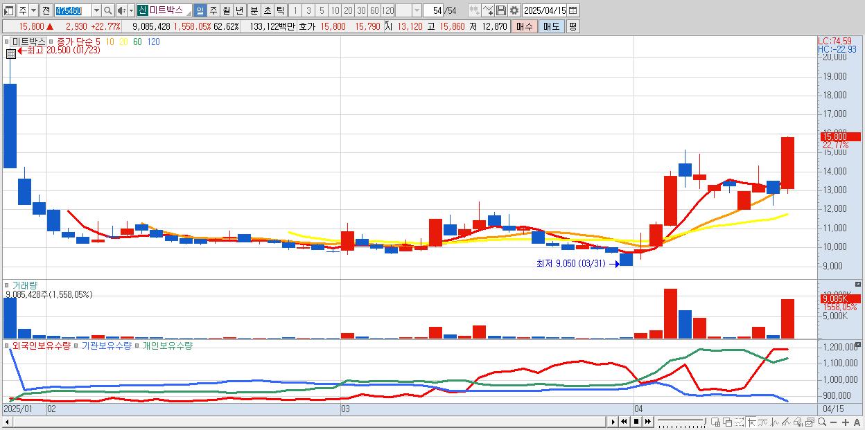 - 미트박스 (15,800원 ▲ 22.77% , 시총: 883억, 거래량: 9,085,428, 거래대금:1,331억)