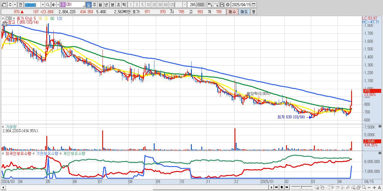 - CBI (970원 ▲ 23.88% , 시총: 496억, 거래량: 2,804,220, 거래대금:26억)