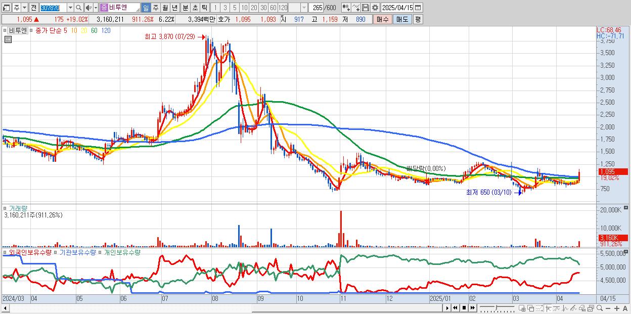- 비투엔 (1,095원 ▲ 19.02% , 시총: 556억, 거래량: 3,160,211, 거래대금:34억)