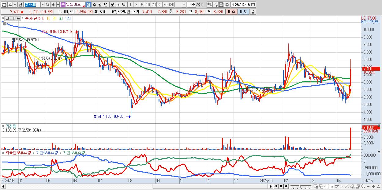 - 딥노이드 (7,340원 ▲ 18.39% , 시총: 1,646억, 거래량: 5,476,141, 거래대금:407억)