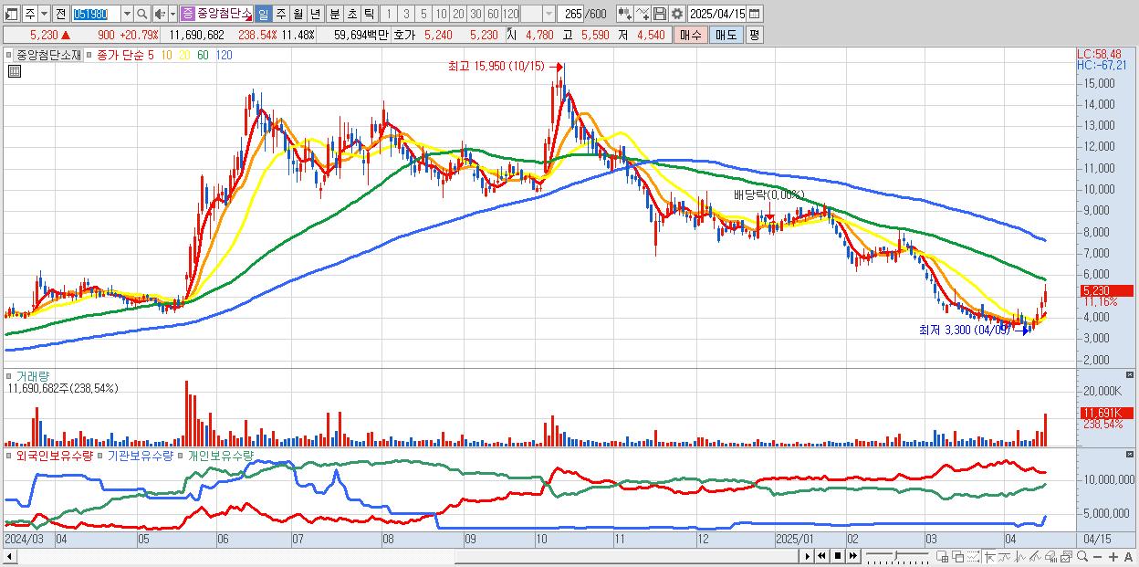 - 중앙첨단소재 (5,280원 ▲ 21.94% , 시총: 5,375억, 거래량: 6,663,100, 거래대금:340억)
