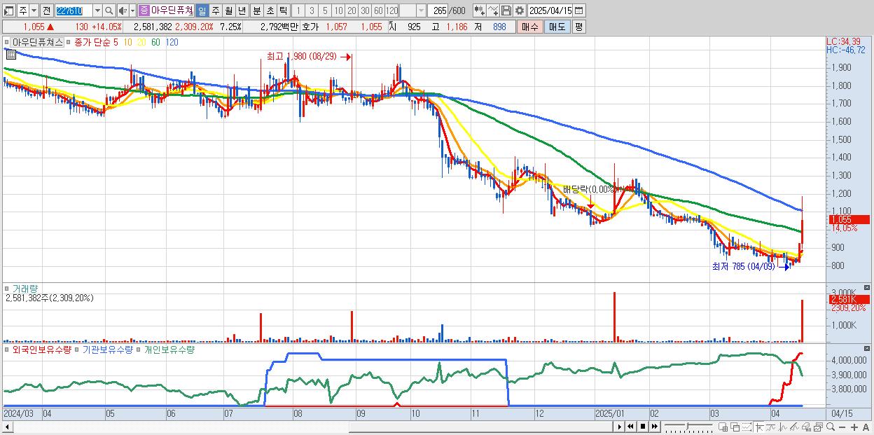 - 아우딘퓨쳐스 (1,055원 ▲ 14.05% , 시총: 375억, 거래량: 2,581,382, 거래대금:28억)