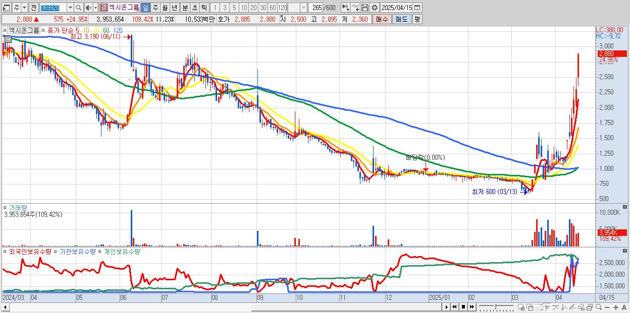 - 엑시온그룹 (2,880원 ▲ 24.95% , 시총: 1,014억, 거래량: 3,953,654, 거래대금:105억)