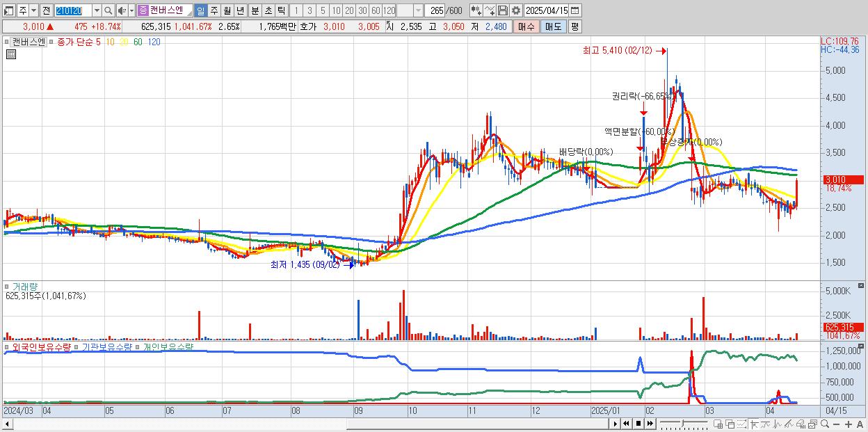- 캔버스엔 (3,010원 ▲ 18.74% , 시총: 710억, 거래량: 625,315, 거래대금:18억)