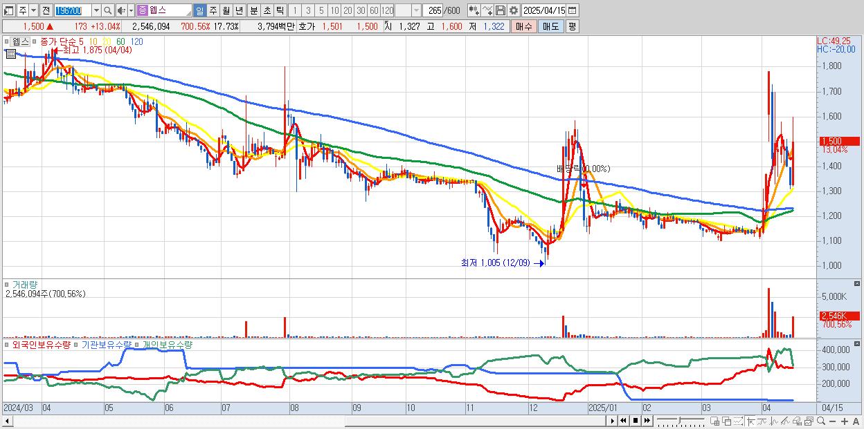 - 웹스 (1,500원 ▲ 13.04% , 시총: 215억, 거래량: 2,546,094, 거래대금:38억)