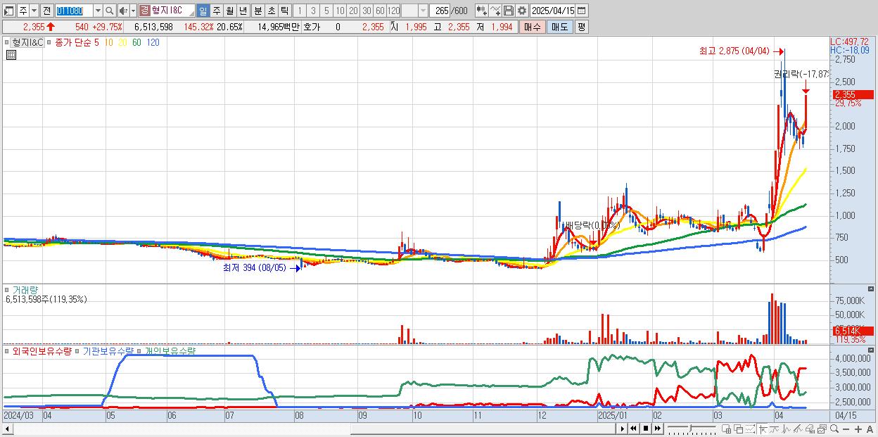 - 형지I&C (2,355원 ▲ 29.75% , 시총: 743억, 거래량: 6,513,598, 거래대금:150억)