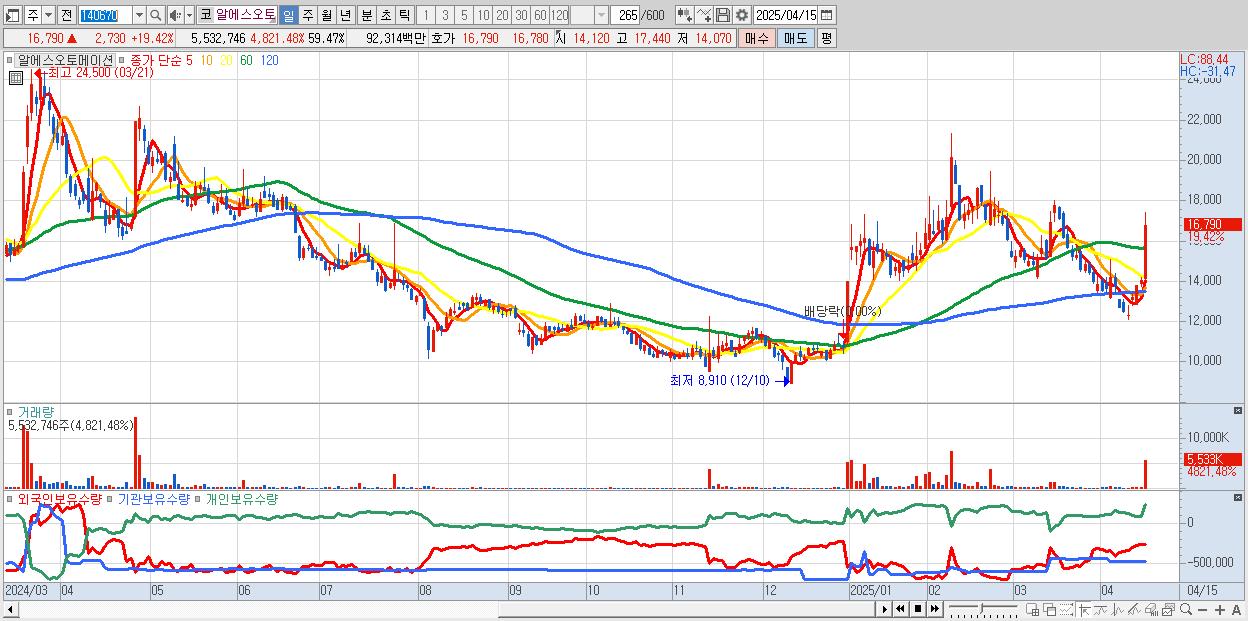 - 알에스오토메이션 (16,790원 ▲ 19.42% , 시총: 1,562억, 거래량: 5,532,746, 거래대금:923억)