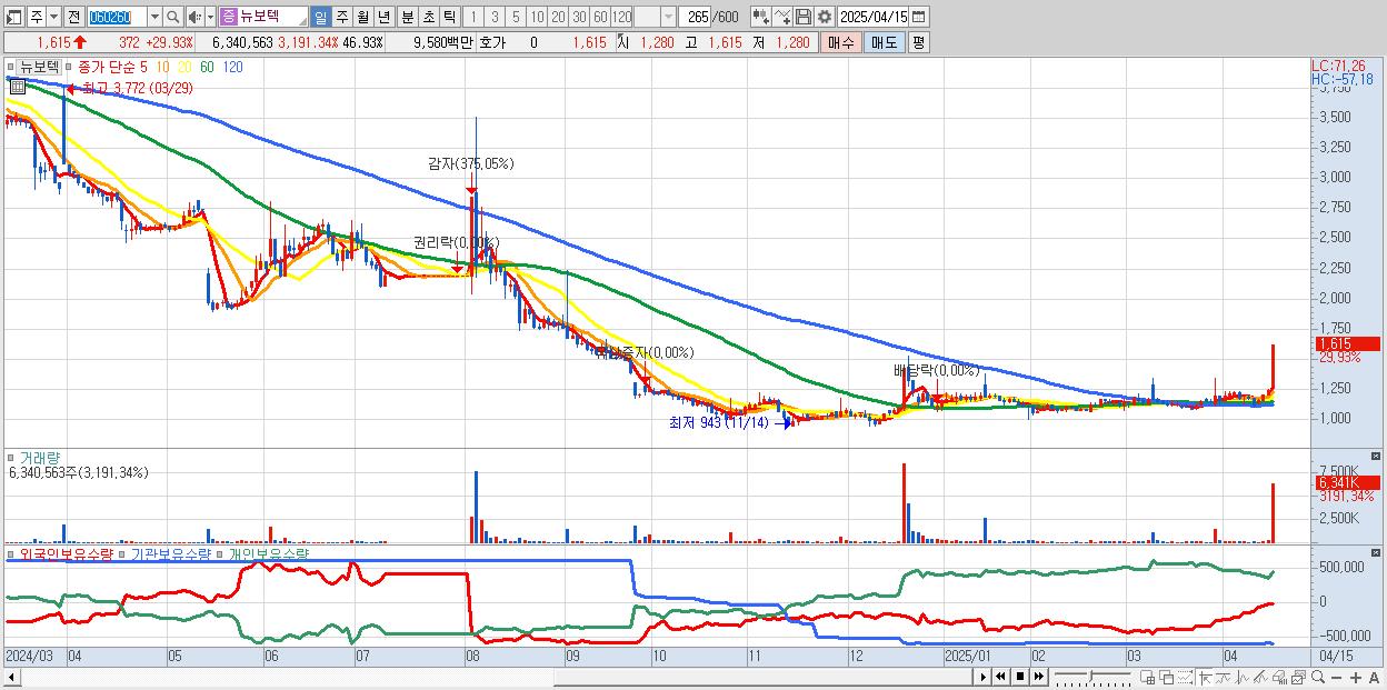 - 뉴보텍 (1,615원 ▲ 29.93% , 시총: 218억, 거래량: 6,340,563, 거래대금:96억)