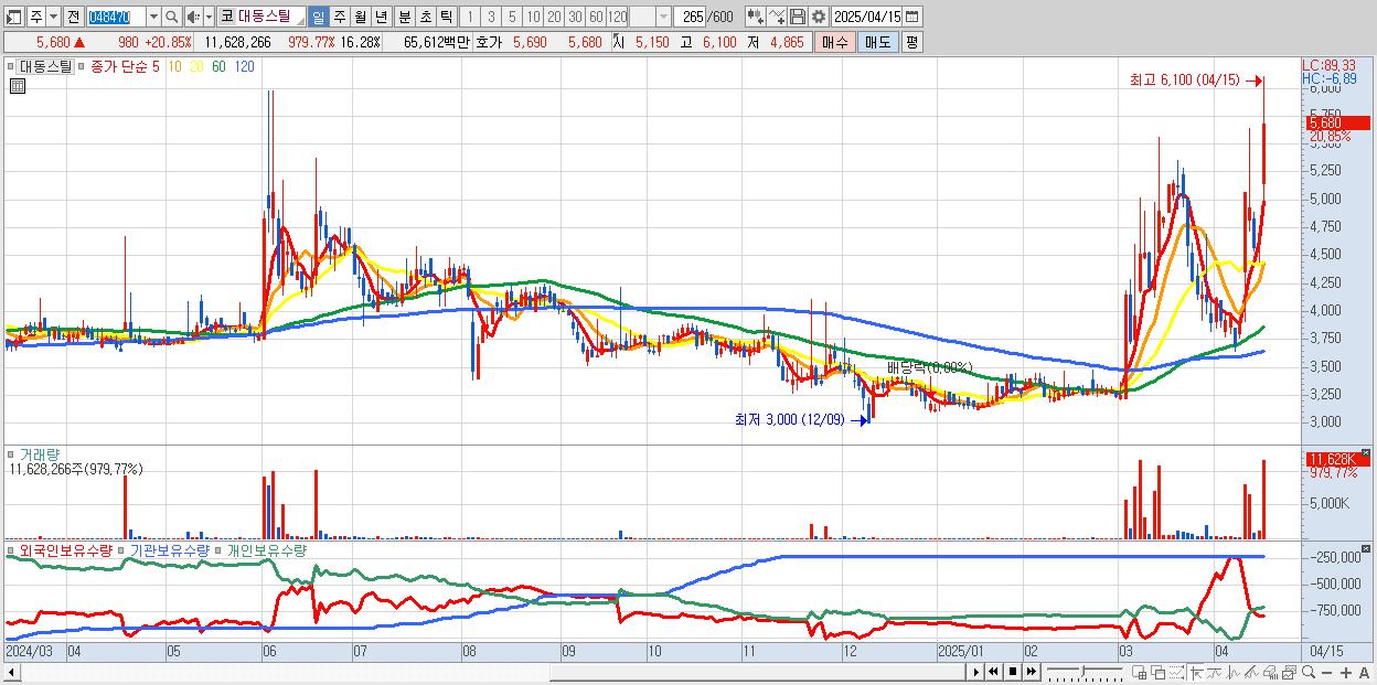 - 대동스틸 (5,680원 ▲ 20.85% , 시총: 568억, 거래량: 11,628,266, 거래대금:656억)