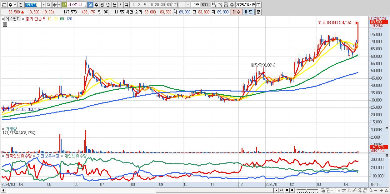- 에스앤디 (83,500원 ▲ 19.29% , 시총: 2,415억, 거래량: 147,573, 거래대금:116억)