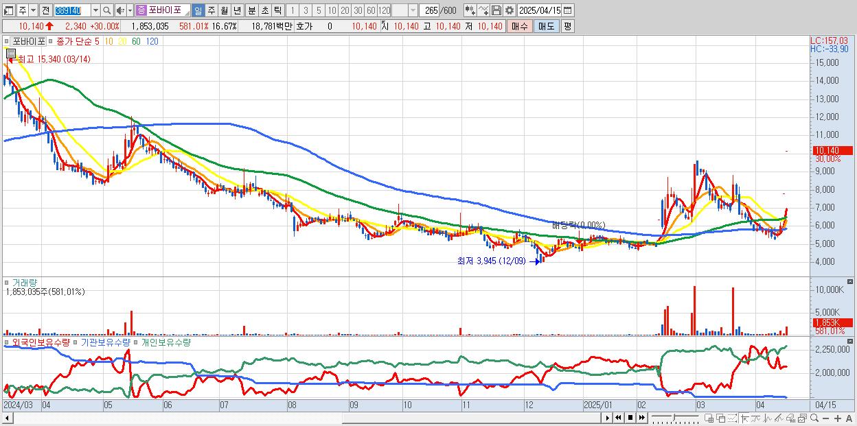 - 포바이포 (10,140원 ▲ 30% , 시총: 1,127억, 거래량: 1,853,035, 거래대금:188억)