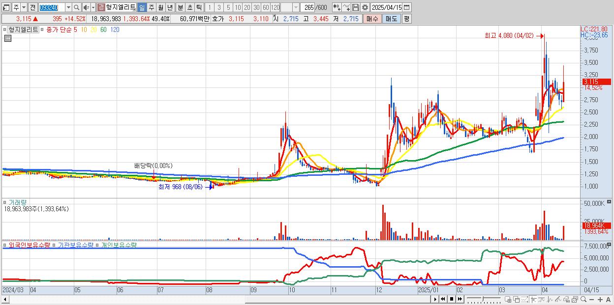 - 형지엘리트 (3,115원 ▲ 14.52% , 시총: 1,196억, 거래량: 18,963,983, 거래대금:610억)