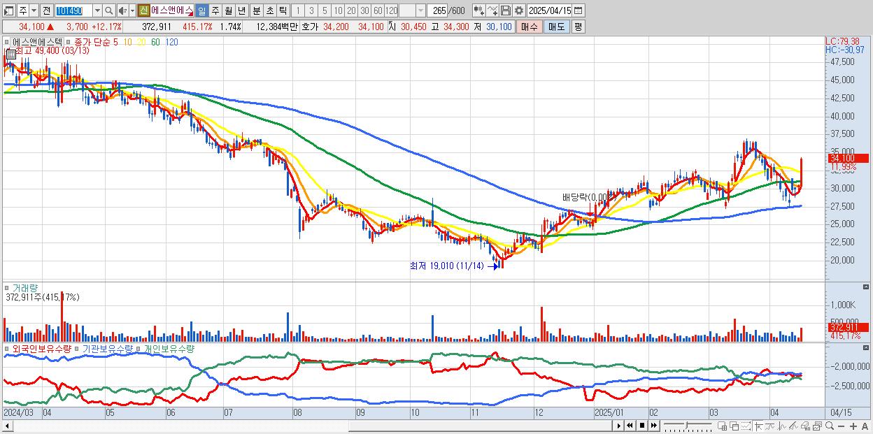 - 에스앤에스텍 (34,100원 ▲ 12.17% , 시총: 7,315억, 거래량: 291,752, 거래대금:97억)