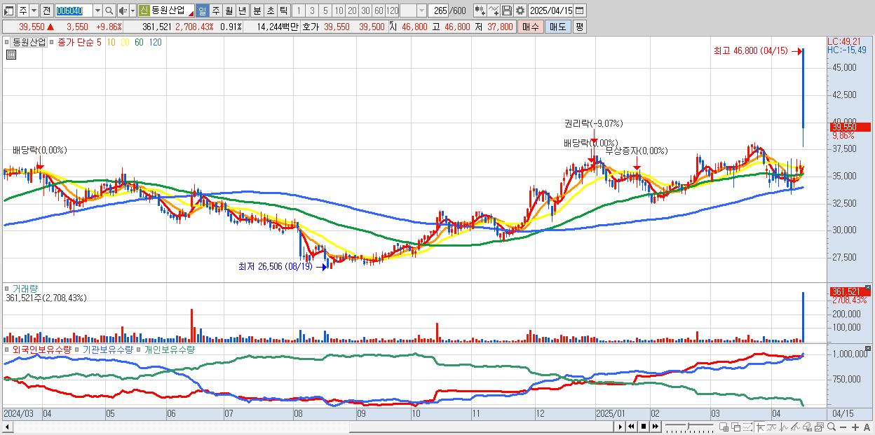 - 동원산업 (39,900원 ▲ 10.83% , 시총: 15,810억, 외국인 순매수 거래금:24억)