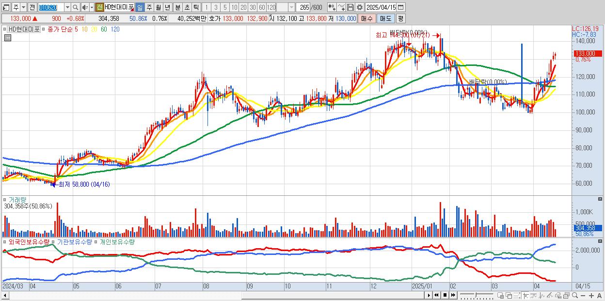 - HD현대미포 (133,300원 ▲ 0.91% , 시총: 53,243억, 외국인 순매수 거래금:25억)