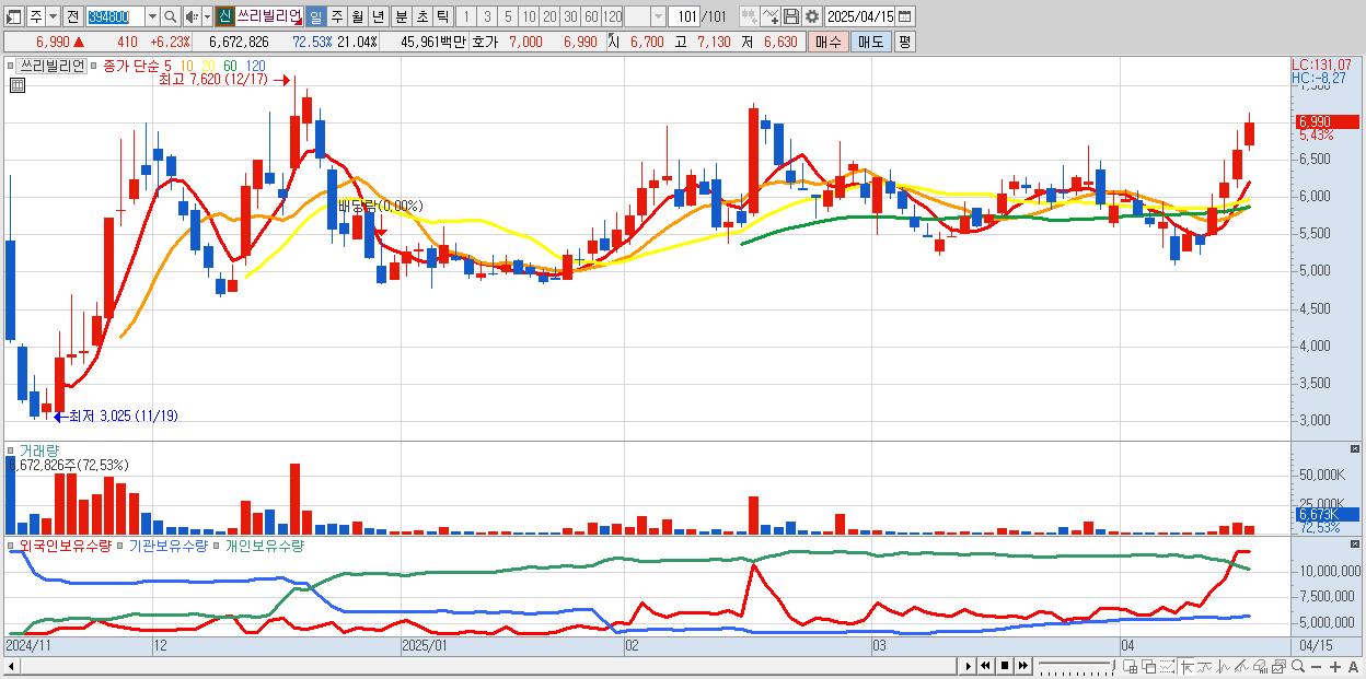 - 쓰리빌리언 (6,810원 ▲ 3.5% , 시총: 2,160억, 외국인 순매수 거래금:23억)