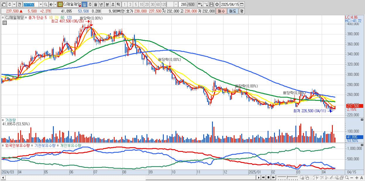- CJ제일제당 (237,500원 ▲ 2.37% , 시총: 35,754억, 외국인 순매수 거래금:26억)