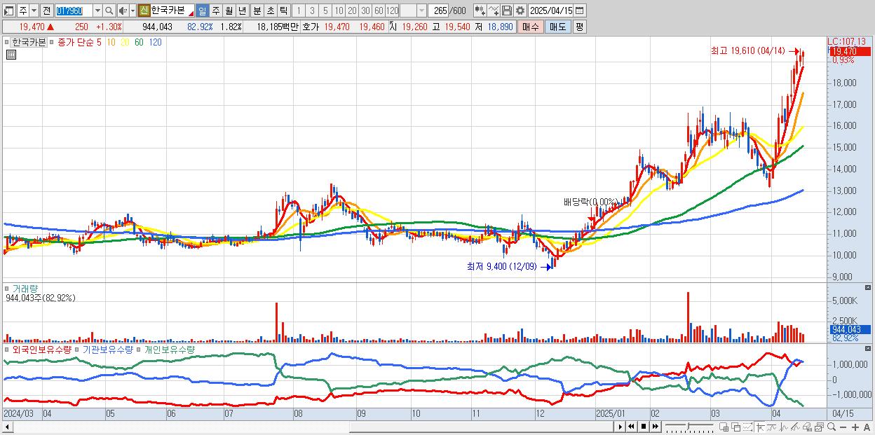 - 한국카본 (19,520원 ▲ 1.56% , 시총: 10,133억, 거래량: 723,531, 거래대금:139억, KOSPI)