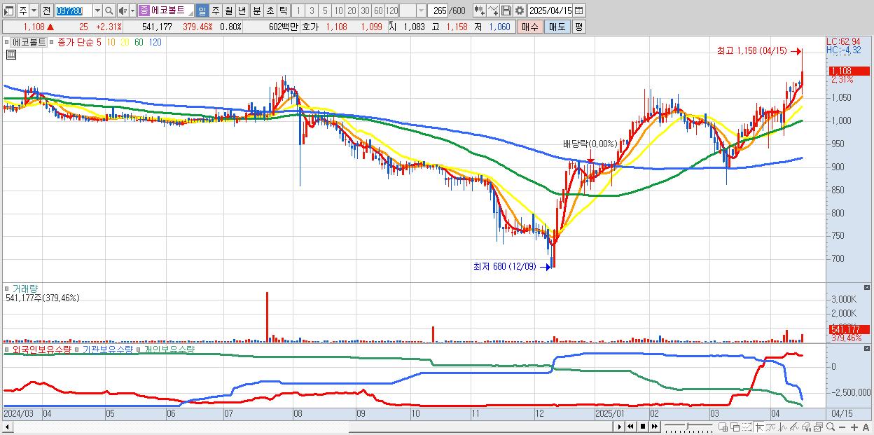 - 에코볼트 (1,108원 ▲ 2.31% , 시총: 750억, 거래량: 541,177, 거래대금:6억, KOSDAQ)