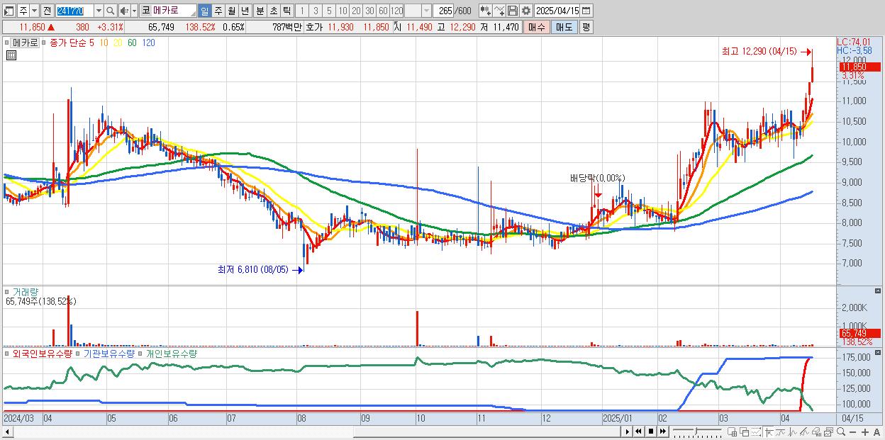 - 메카로 (11,850원 ▲ 3.31% , 시총: 1,208억, 거래량: 65,749, 거래대금:8억, KOSDAQ)