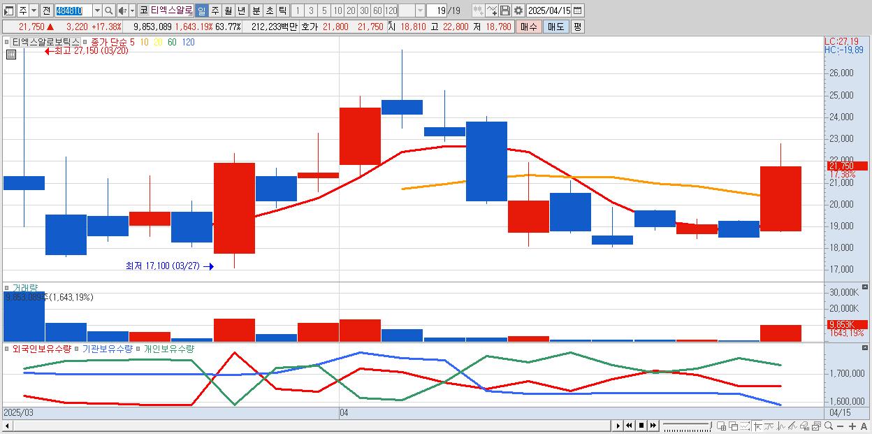 - 티엑스알로보틱스 (21,750원 ▲ 17.38% , 시총: 3,361억, 거래량: 9,853,089, 거래대금:2,122억)