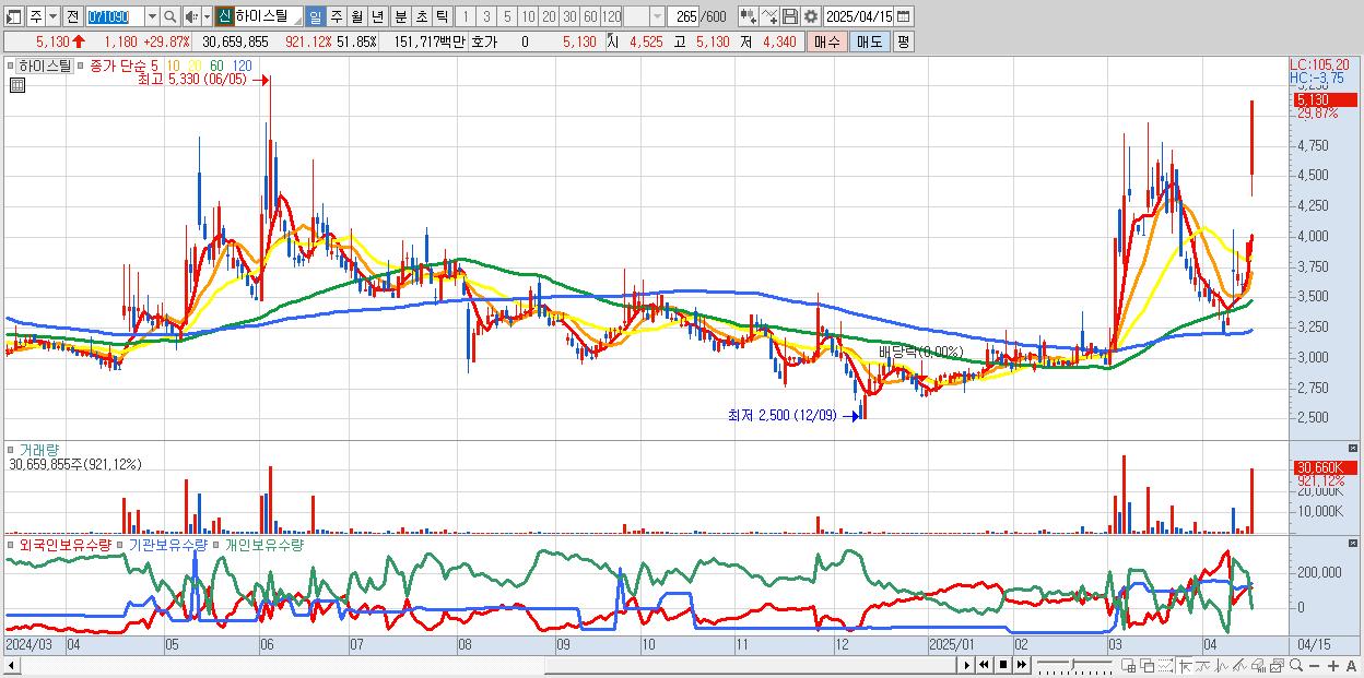 - 하이스틸 (5,130원 ▲ 29.87% , 시총: 1,036억, 거래량: 30,659,855, 거래대금:1,517억)