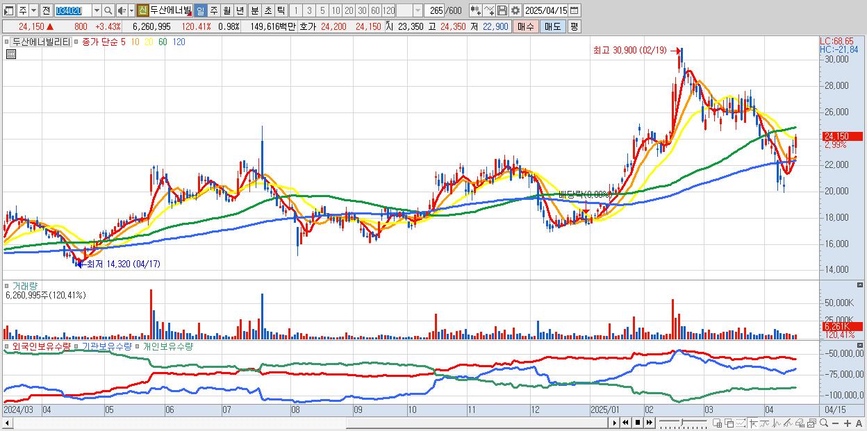 - 두산에너빌리티 (24,100원 ▲ 3.21% , 시총: 154,375억, 거래량: 3,836,499, 거래대금:918억)