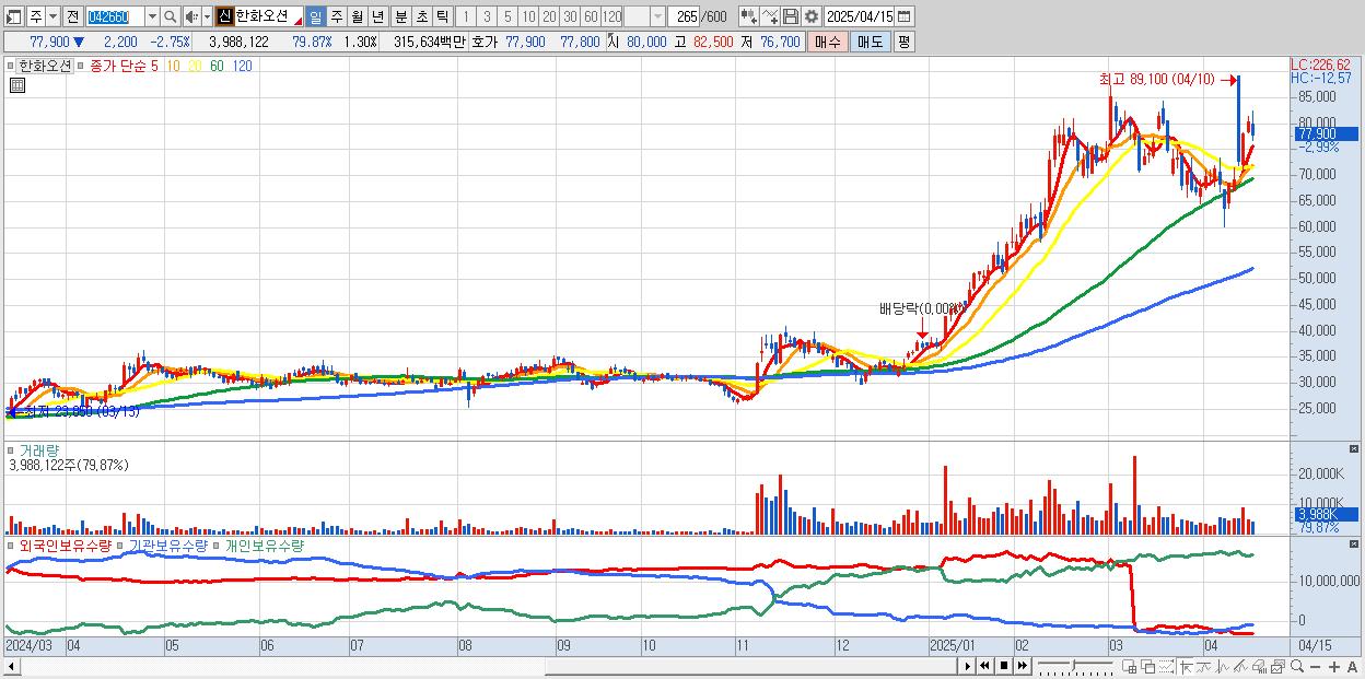 - 한화오션 (79,400원 ▼ -0.87% , 시총: 243,292억, 거래량: 1,973,213, 거래대금:1,563억)