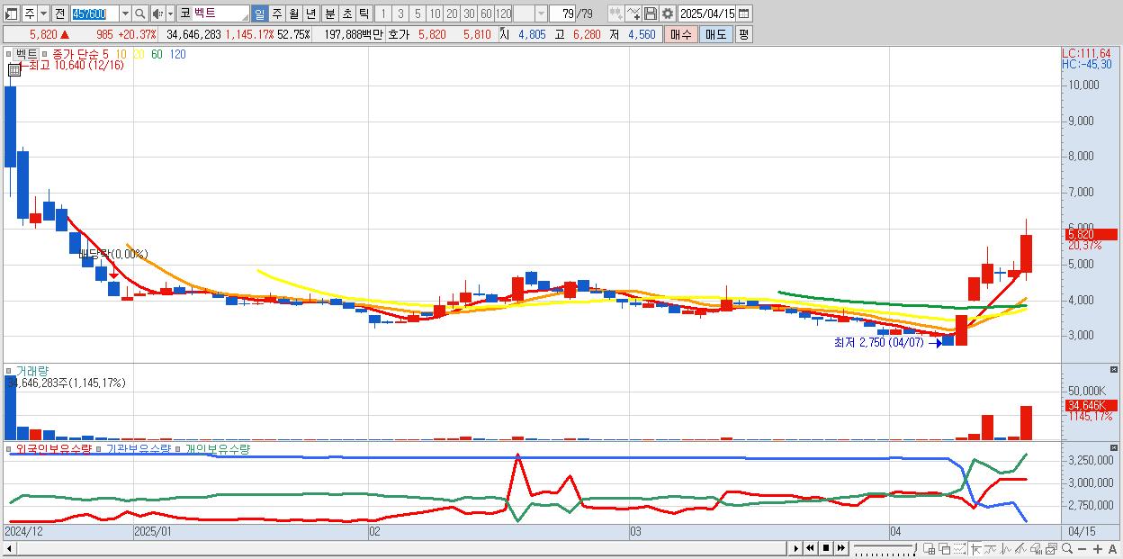 - 벡트 (5,820원 ▲ 20.37% , 시총: 798억, 거래량: 34,646,283, 거래대금:1,979억)