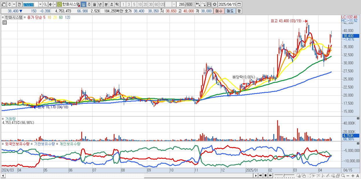 - 한화시스템 (38,850원 ▲ 0.78% , 시총: 73,395억, 거래량: 2,601,481, 거래대금:1,005억)