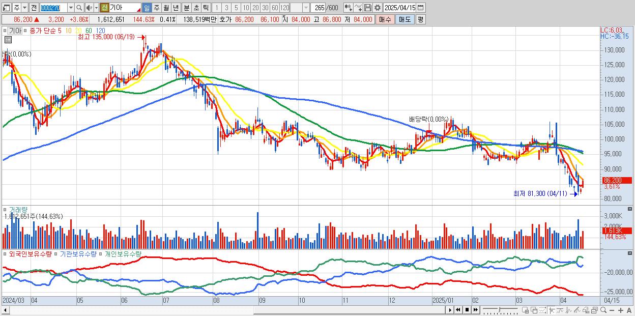 - 기아 (85,800원 ▲ 3.37% , 시총: 341,203억, 거래량: 1,128,439, 거래대금:970억)