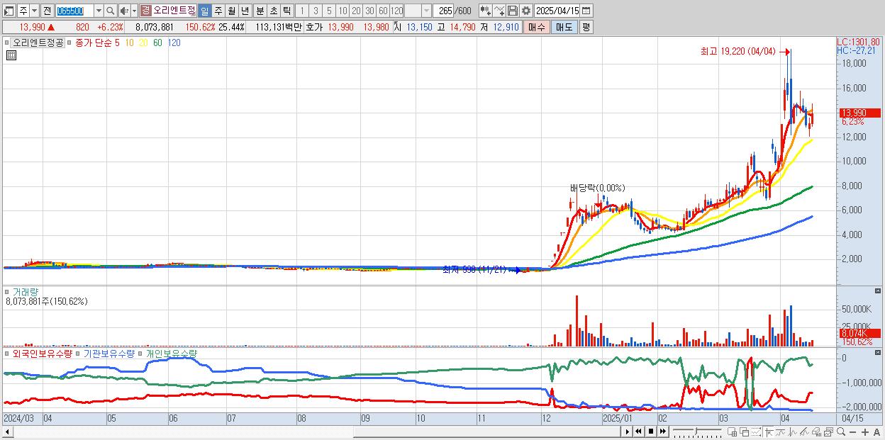 - 오리엔트정공 (13,990원 ▲ 6.23% , 시총: 4,441억, 거래량: 8,073,881, 거래대금:1,131억)