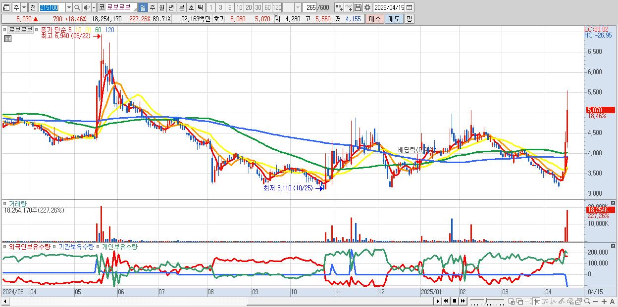 - 로보로보 (5,070원 ▲ 18.46% , 시총: 1,032억, 거래량: 18,254,170, 거래대금:922억)