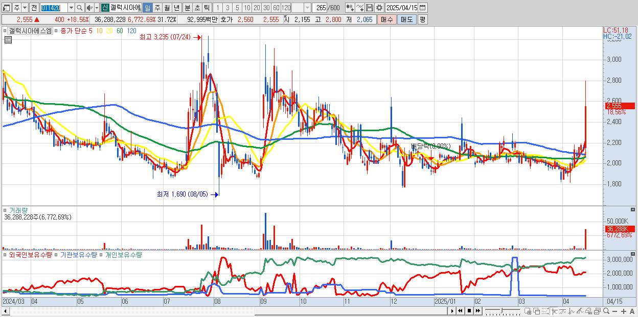 - 갤럭시아에스엠 (2,555원 ▲ 18.56% , 시총: 704억, 거래량: 36,288,228, 거래대금:930억)