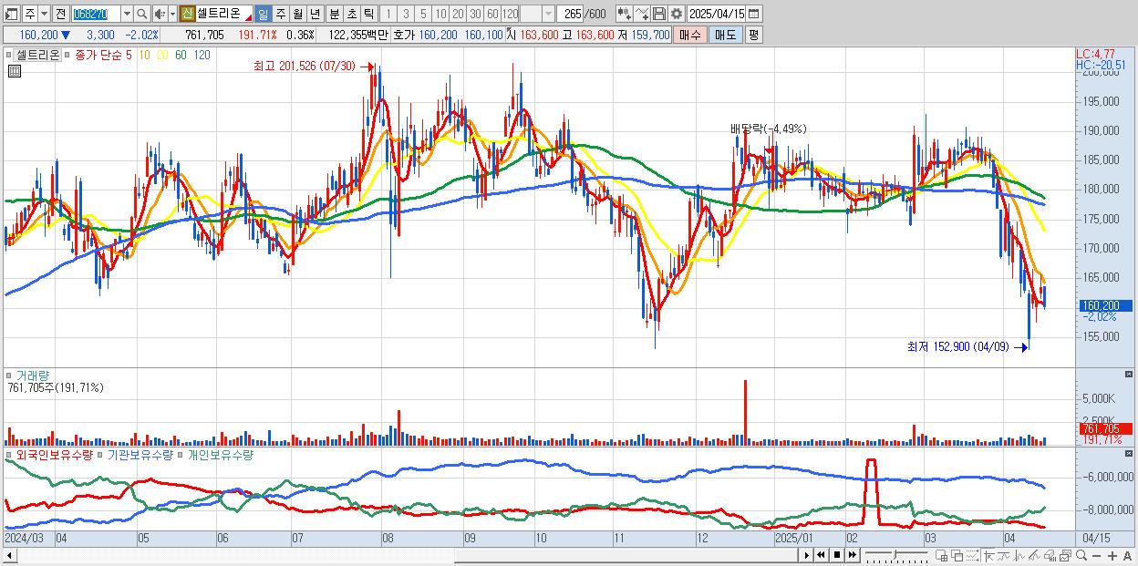 - 셀트리온 (159,800원 ▼ -2.26% , 시총: 340,385억, 거래량: 574,664, 거래대금:923억)