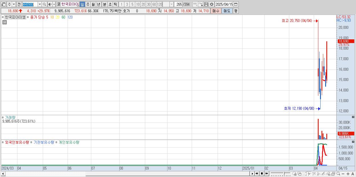 - 한국피아이엠 (18,690원 ▲ 29.97% , 시총: 1,122억, 거래량: 9,985,616, 거래대금:1,708억)