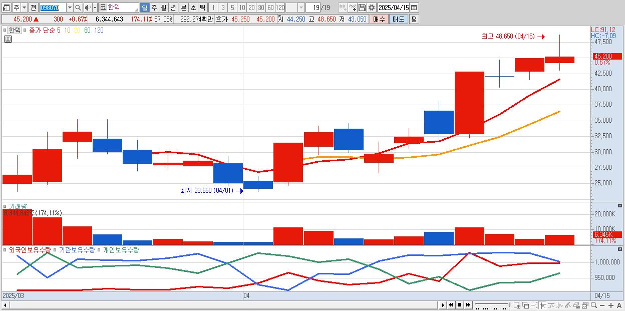 - 한텍 (45,200원 ▲ 0.67% , 시총: 5,027억, 거래량: 6,344,643, 거래대금:2,923억)