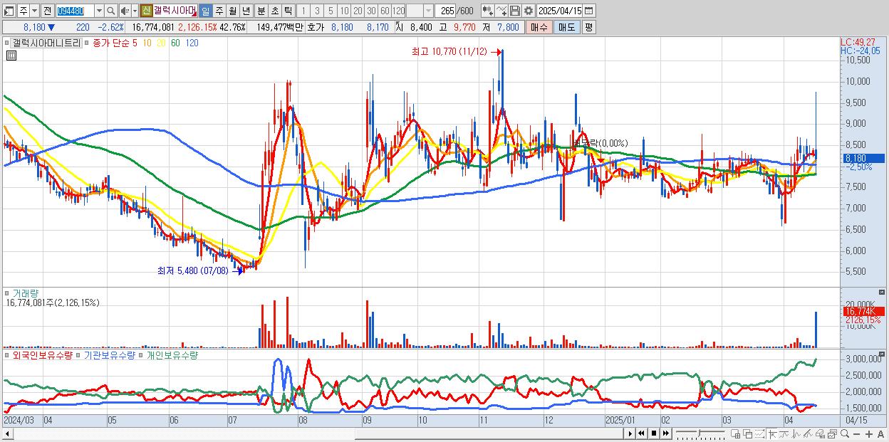- 갤럭시아머니트리 (8,230원 ▼ -2.02% , 시총: 3,229억, 거래량: 10,726,794, 거래대금:954억)